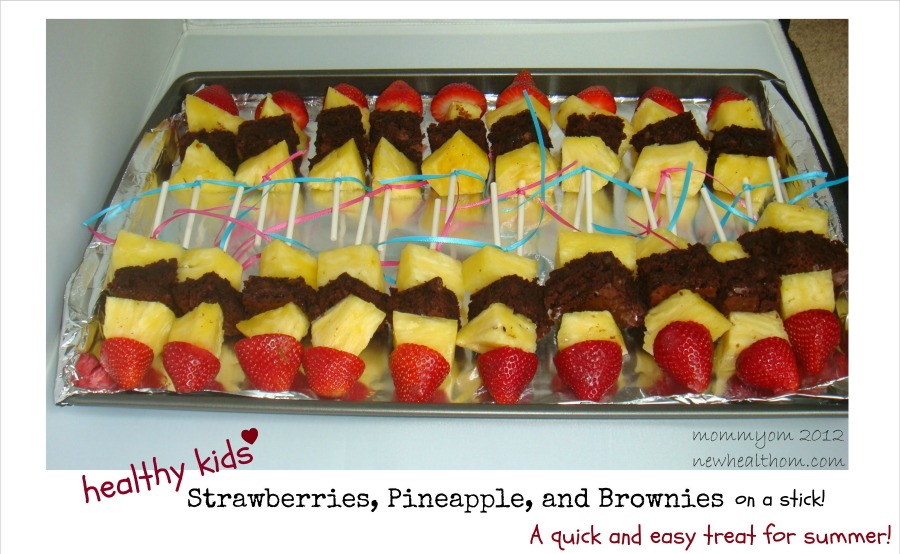 Ella celebrated her birthday in school this past Wednesday. She is a summer baby (July 7th), but the class threw a cute little party for her since they won’t be together for her real birthday. I needed to send in a birthday treat for the impromptu event. I decided to forego the cupcakes, cake and ice cream. I wanted to make a healthy snack, but I also wanted to make it “special” because it was her birthday. In this case, ‘special’ means some sort of chocolate or candy or sweet yummy goodness that almost always includes frosting and almost always is not healthy for you in any way. I went with brownies sans the frosting. Then I got creative (by my standards anyway!). How about fruit and brownies on a stick? Um, hello! Perfect. What kid doesn’t like a treat on a stick? Am I right?