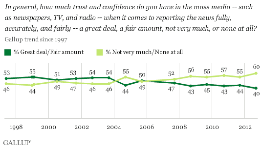 A new Gallup Poll out last week reported that 60% of Americans have little or no trust in the mass media to report the news fully, accurately, and fairly.
